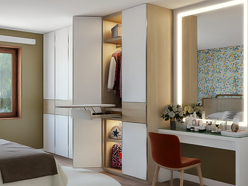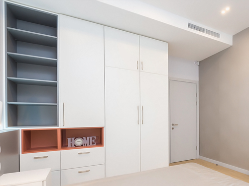 Give that perfect look to your bedroom with closet spaces covered by hinged doors. This is a common theme for Indian bedrooms.
